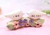This little pair of love birds is resting on a Happily ever after rock, handmade from stoneware clay, stamped with your initials glazed in a color of your choice.